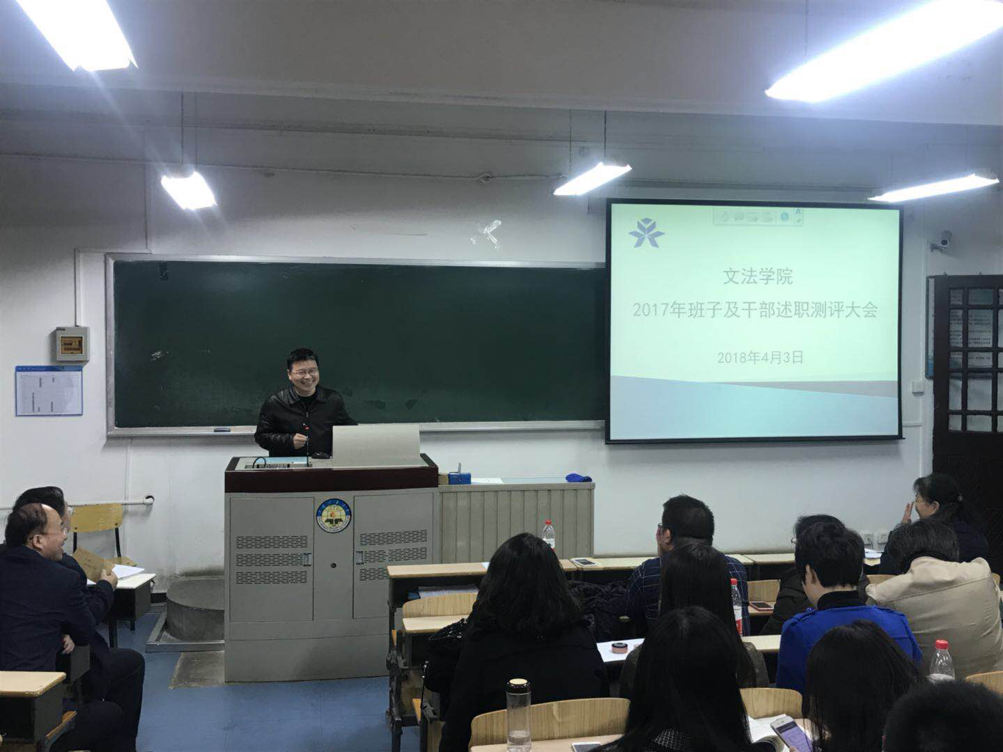 4月3日下午,文法学院2017年度学院班子及干部述职测评大会在理化楼205顺利召开。校党委组织部副部长高来举出席会议。文法学院领导班子成员、全体教师干部以及部分学生代表参加会议。会议由院党委书记董会泽主持。