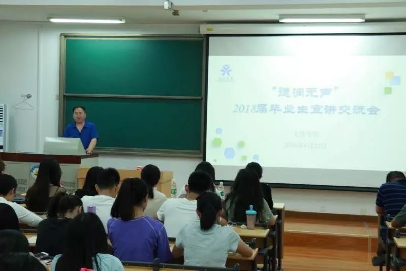 6月22日晚,文法学院在沙河校区教三402教室召开了“德润无声”2018届毕业生分享交流会。文法学院党委书记董会泽、学工办主任陆雪松、辅导员陈蒙、八名优秀毕业生以及文法学院全体2017级本科生参加了此次座谈会。