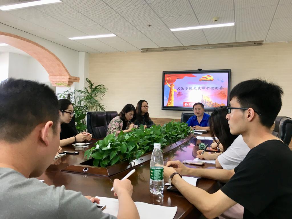 2018年7月4日,为培养各党支部书记的爱国主义情怀,加强思想政治教育,提高业务能力,文法学院于逸夫楼1214室召开了本学期最后一次党支部书记例会,进行集体理论学习,部署本学期党建收尾工作及下学期党建工作的重点方向。会议由院党委书记董会泽主持,院党委秘书、各教师及学生党支部书记参加了会议。