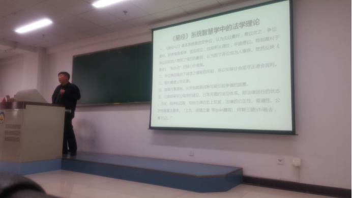 12月15日上午,国际易学联合会荣誉会长兼首席专家程铖教授在逸夫楼917教室发表“《易经》系统智慧学中的法学理论”的主题演讲,法学专业研究生和其他感兴趣的同学到场聆听,文法学院殷召良院长主持并点评。