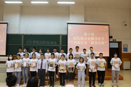 殷召良为本科20级新生进行了赠书,希望同学们“书海泛舟、修身启智”,多读书,读好书,好读书。