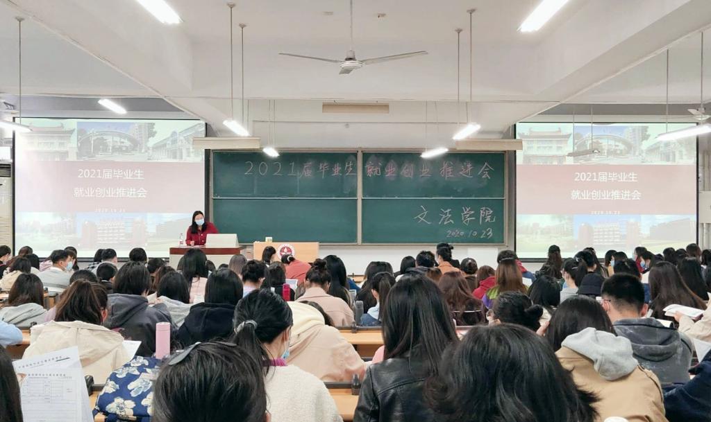 为进一步推进2021届毕业生就业创业工作,引导同学们树立正确的择业就业观念,认清形势、明确目标、做好规划、振奋精神,学院于2020年10月23日下午14:00在教学楼106召开了文法学院2021届毕业生就业创业推进会。学校学生工作处副处长、大学生就业创业指导中心主任童军武,学院研究生兼职辅导员任智丽,学院本科生2017级辅导员李冬雪出席了此次会议。会议由李冬雪主持,学院200余名2021届毕业生参加了此次大会。