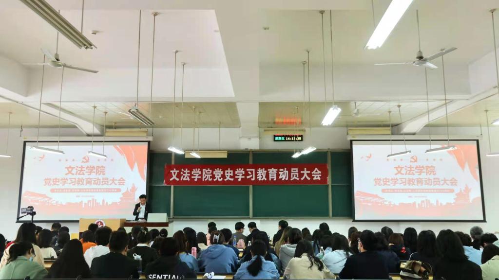 按照学校党委部署,4月2日下午,文法学院在教学楼209召开党史学习教育动员大会。校党委副书记王忠强,学校党史学习教育第三巡回指导组组长、校纪委副书记、监察处处长胡喜宽,副组长、党委巡察办公室副主任解士军,联络员邹殿龙等出席会议。文法学院党委书记杨洪兵作动员报告。学院领导班子成员、全体教职工、学生党员及学生干部近200人现场参会,沙河校区学生党员和学生干部通过线上方式同步参会。文法学院院长殷召良主持会议。