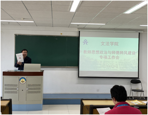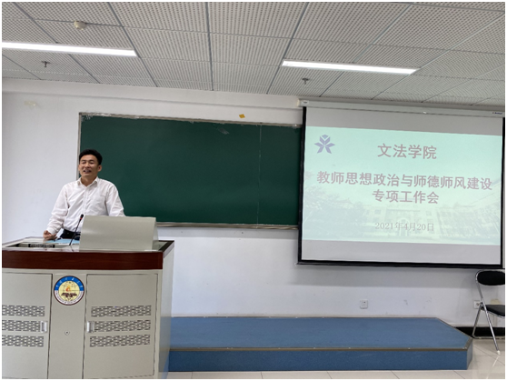 4月20日下午,文法学院在逸夫楼917召开教师思想政治与师德师风建设专项工作会,专题学习《新时代高校教师职业行为十项准则》和《教育部关于高校教师师德失范行为处理的指导意见》文件精神。院长殷召良、院党委书记杨洪兵、副院长许卉艳、刘金程、谭爽及文法学院全体教职工参加了此次会议。