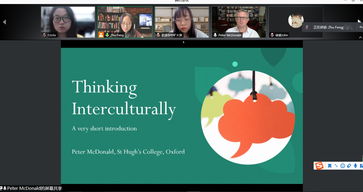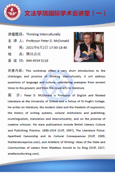 应文法学院外语系朱峰教授邀请,牛津大学Peter D. McDonald教授于2021年6月2日为外语系研究生举办了题为Thinking Inter-culturally的讲座。此讲座为英语专业研究生国际前沿课程系列讲座之一,讲座通过腾讯会议平台进行,由朱峰老师主持。英语专业研究生、本科生,非英语专业研究生、本科生,以及外语系部分老师参加了讲座。