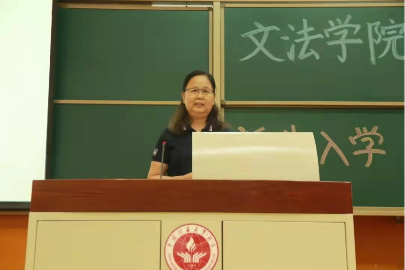 谭爽副院长分别从学院专业介绍、人才培养特色、年度重点任务和嘱咐与祝福四个方面对本科生大学生活进行了讲解与指导,并重点强调了大学四年中不同阶段的努力方向,她希望各位同学全面发展,不负青春,在文法学院成就理想的自己。