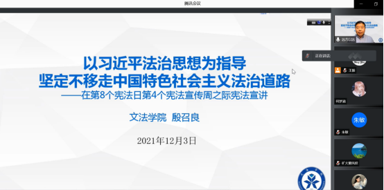 2021年12月4日是第八个国家宪法日,11月29日-12月5日是全国第四个“宪法宣传周”。为认真学习贯彻习近平法治思想,深入贯彻落实党的十九大和十九届二中、三中、四中、五中、六中全会精神,推动全校师生学习宣传宪法,弘扬宪法精神,维护宪法权威,12月3日,文法学院院长殷召良做“以习近平法治思想为指导,坚定不移走中国特色社会主义法治道路”线上宪法主题宣讲,全校共计260余名师生参加。