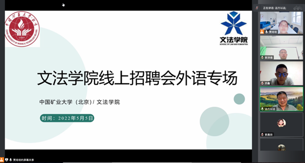 5月5日,北京思高乐教育科技有限公司和北京欧冶教育咨询有限公司与中国矿业大学(北京)文法学院校企合作促就业外语专业专场招聘会在线上举行。校党委副书记王忠强出席会议并讲话。北京思高乐教育科技有限公司创始人郭泽德、北京欧冶教育咨询有限公司副总经理乔鑫、文法学院院长殷召良、院党委书记杨洪兵、外语系主任贾培培、各年级辅导员以及本硕毕业生参加了会议。贾培培主持会议。