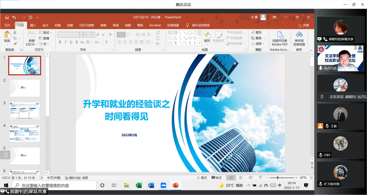2022年5月13日,文法学院在线上举行校企合作促就业暨校友职业发展论坛。文法学院校友丁亚亚、郝蔚钊,文法学院院长殷召良,院党委书记杨洪兵,各年级辅导员以及各年级同学参加会议。会议由殷召良主持。