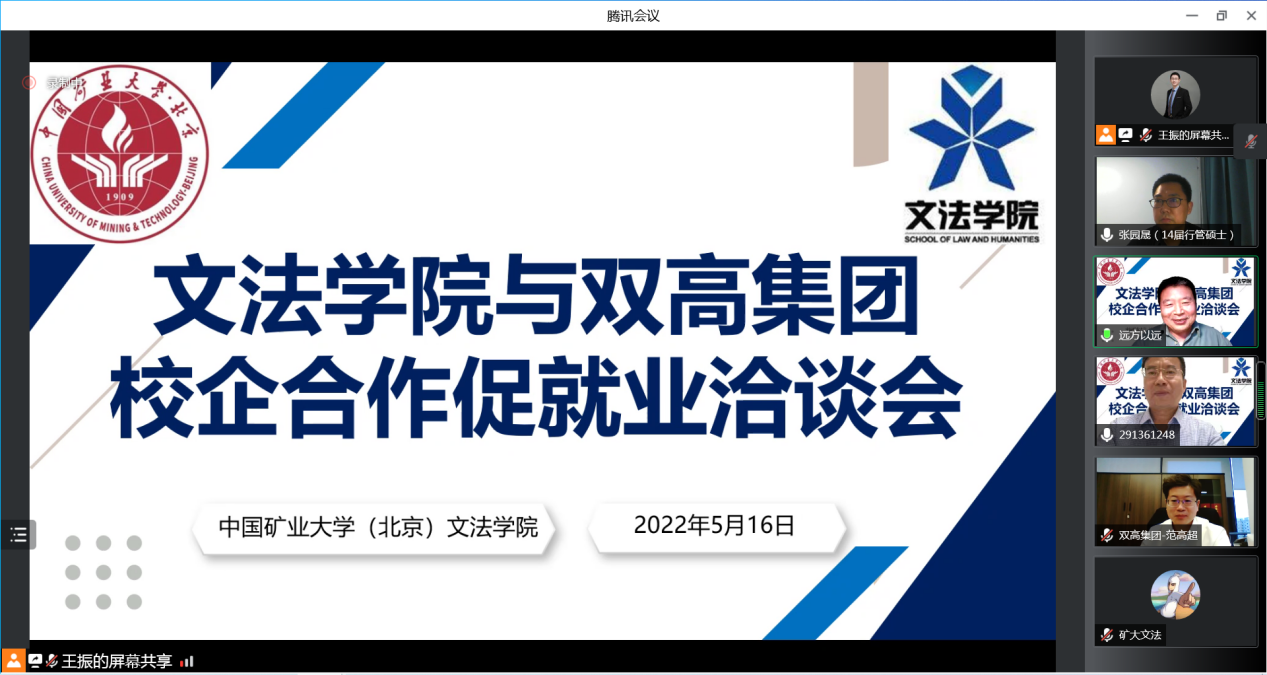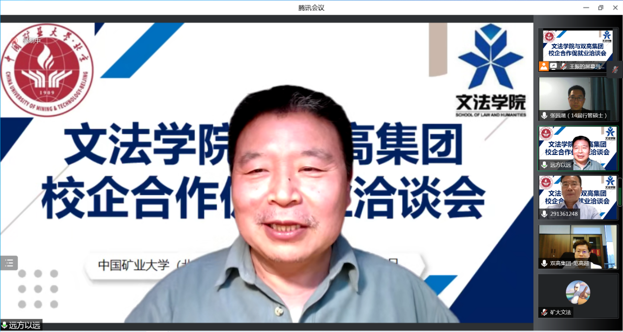 5月16日,文法学院与北京双高国际人力资本集团以线上方式举行校企合作促就业洽谈会。校党委副书记王忠强出席会议并讲话。北京双高集团人才发展事业部负责人、北京双高志远管理咨询有限公司副总经理范高超,北京市昌平区市场监督管理局市场科副科长、文法学院2014届行政管理硕士张园晟,文法学院院长殷召良,院党委书记杨洪兵,各年级辅导员、各年级同学及部分校友参加会议。殷召良主持会议。
