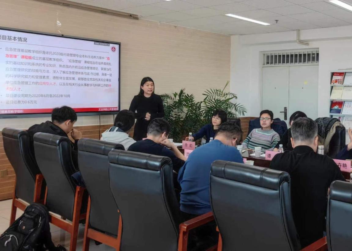 谢起慧老师对《行政管理系应急管理基层教学组织建设》项目建设情况进行汇报。该项目从制度建设及课程建设两个维度开展,已形成民主议事制度及三段式教学过程管理制度,以及涵盖质量控制、档案管理、反馈机制的教学规范;教学团队围绕方法创新、教材编写和课程思政进行教学改革,在师资队伍建设、学生培养以及课程建设方面均取得很好的效果。
