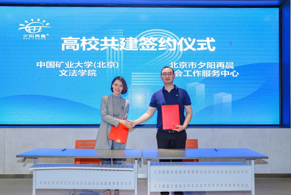 2023年5月21日,中国矿业大学(北京)文法学院与北京市夕阳再晨社会工作服务中心在北京市海淀区二里庄社区党群服务中心举行了实践教学基地签约仪式。夕阳再晨社会工作服务中心创始人张佳鑫、联合创始人何绍森,文法学院副院长谭爽、公共管理系副主任谢起慧、公共管理系教师张欢欢等人参加仪式。