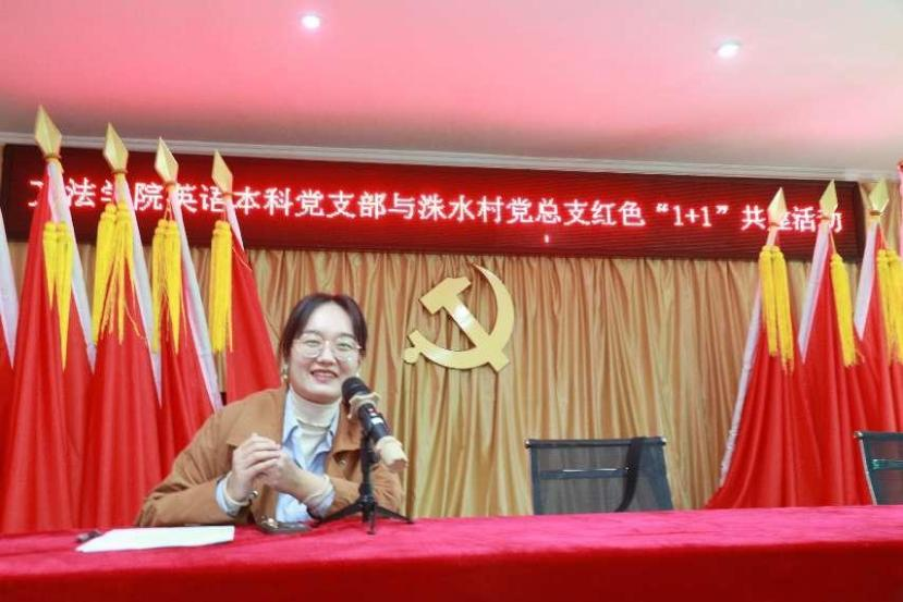 学生党员田静莹分享了在洙水村开展社会实践的宝贵经历以及重回洙水村的激动喜悦。暑假期间,她积极响应“千人百村”计划,带队在洙水村实地调研一个多月,多次登山峦、下农田、入村户、写调研,收获了丰厚的基层实践经历,与洙水村结下了深厚的情谊。