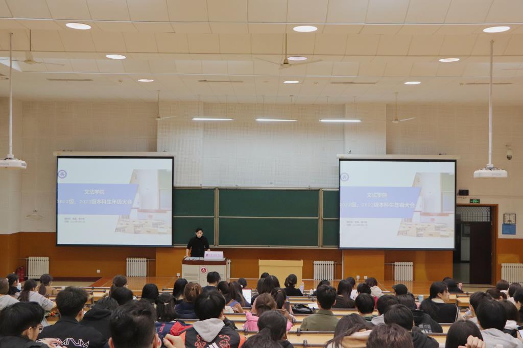 2024年3月11日,文法学院在沙教1-327召开2022级、2023级本科生年级大会。文法学院党委副书记董凤姣出席本次大会。本科2023级辅导员娄真,本科2022级辅导员穆子君就新学期同学们关注的重点问题进行了讲解,大会由娄真主持。