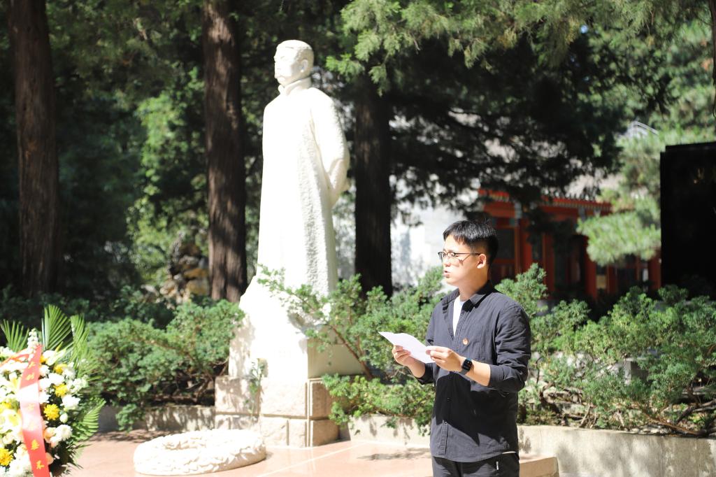 烈士陵园庄严肃穆,苍松静默。文法学院2025年青马工程培训班全体学员齐聚李大钊烈士雕像前,默哀致敬。古云龙同学以“以青春之我,创青春之国家”为主题发言,回顾李大钊同志作为中国共产党主要创始人之一的革命历程,号召学员们筑牢信仰之基,接过时代的炬火继续奋斗。随后,王哲同学带领全体成员重温入团誓词,铿锵誓言响彻陵园,展现了学员们坚定的理想信念与担当。