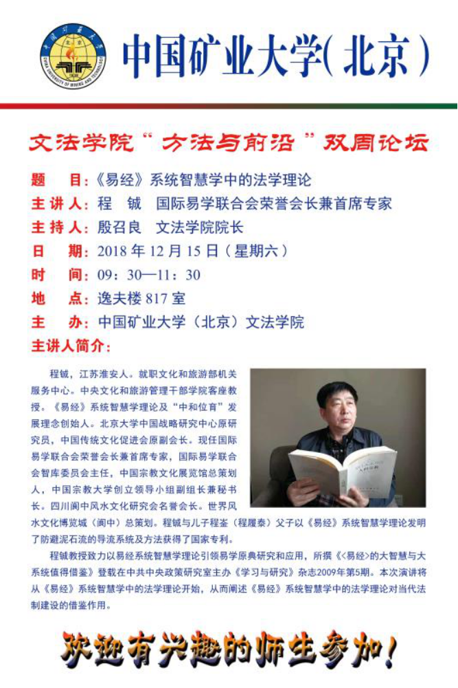 12月15日上午,国际易学联合会荣誉会长兼首席专家程铖教授在逸夫楼917教室发表“《易经》系统智慧学中的法学理论”的主题演讲,法学专业研究生和其他感兴趣的同学到场聆听,文法学院殷召良院长主持并点评。