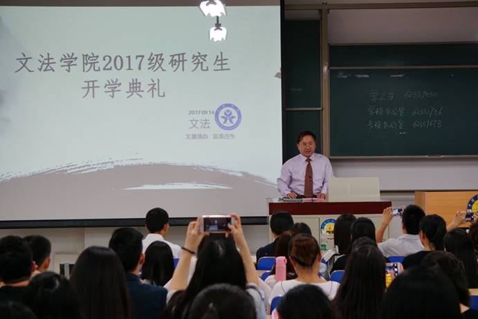 下午二时许,开学典礼在庄严的国歌声中拉开了序幕,学院院长殷召良老师为大会致欢迎词。殷院长首先向2017级研究生新生表示欢迎,继而向新生介绍了文法学院的相关情况,提出了研究生的培养和要求,表达了对新生的殷切希望。