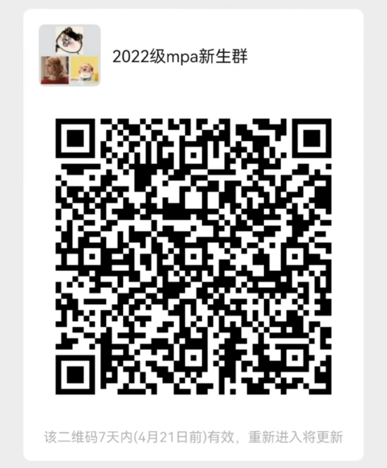 1. 加入2022级MPA新生微信群,进群后务必将自己的备注改成真实姓名(身份不实的会定期清理)。群二维码如下(群二维码只有7天有效期,过期后请发邮箱联系学校询问新二维码):