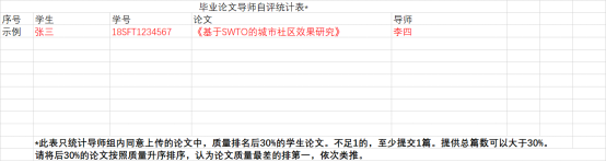 (三) 导师自评。各导师根据已公布的预答辩评审名单,进行组内自评。确定参加预答辩评审的学生名单,并根据组内学生论文质量,在同意参加预答辩评审的学生名单中,选出质量排名后30%的论文(可以大于这一比例),并根据质量进行排队,填写毕业论文导师自评统计表(见附件1),确定预答辩评审集中评审名单并反馈给MPA教育中心。不在导师提交的预答辩评审集中评审名单内的学生视为预答辩评审通过。( 第一、第二导师共同指导的情况,30%比例分开单独计算。计算比例后,小于0.5的,提交1篇;小数点数自动进位,比如1.2的提交2篇)