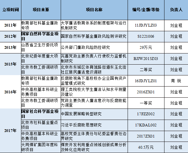 围绕廉政建设与反腐败,廉政中心研究人员积极申请国家级、省部级科研基金项目,先后获得国家自然科学基金、国家社会科学基金、教育部人文社会科学基金、北京社科基金、中共北京市纪委年度重大项目以及中央高校基本科研业务费项目的资助,部分研究成果为相关理论研究和政策咨询提供参考。廉政研究中心在筹备期间以及正式成立以来研究人员课题立项情况如下表所示: